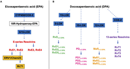 Overview of the pathways of the endogenous synthesis of specialized pro-resolving mediators (SPMs) from (A) eicosapentaenoic (EPA) and (B) docosapentaenoic (DHA) acid. CYP450, cytochrome 450 mixed function oxidase enzymes; COX, cyclooxygenase; LOX, lipoxygenase. It should be noted that not all intermediates and enzymes are indicated.