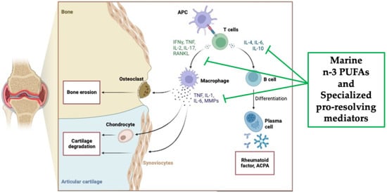 Overview of the pathological pathways in rheumatoid arthritis and the potential anti-inflammatory mechanisms of action of marine n-3 PUFAs as well as specialized pro-resolving mediators (SPMs) (created with Biorender.com, accessed on 22 November 2023).