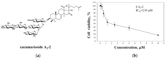 - Aminin, D.L.; Chaykina, E.L.; Agafonova, I.G.; Avilov, S.A.; Kalinin, V.I.; Stonik, V.A. Antitumor activity of the immunomodulatory lead Cumaside. Int. Immunopharmacol. 2010, 10, 648–654. [Google Scholar] [CrossRef]