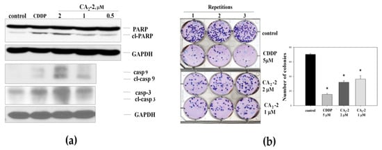 Cleavage of caspase-3, -9, and PARP-1 in PC-3 cells treated with CA2-2 for 48 h. Cisplatin (CDDP) was used as a positive control (a). Effect of triterpene glycoside of CA2-2 on colony formation of PC-3 tumor cells. Cisplatin (CDDP) was used as a positive control (b). Incubation time in either experiment was 48 h. All experiments were performed in triplicates. * p ≤ 0.05.