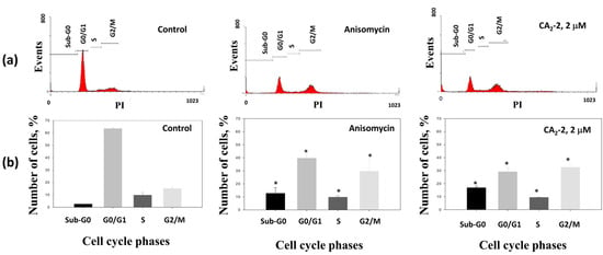 The effects of CA2-2 on cell cycle progression were evaluated using flow cytometry. In this assay, anisomycin was used as a positive control, being able to induce apoptosis and increasing the fraction of aneuploid cells containing fragmented DNA (appearing as sub-G0 phase) [31,32,33,34].