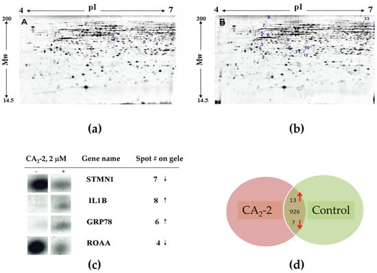 Hence, we performed an analysis of proteins after the treatment of PC-3 cells with CA2-2. Tumor cells were incubated with the compound for 48 h, followed by protein isolation and separation by two-dimensional gel electrophoresis. Figure 4 represents images of the 2D-PAGE gels from control versus CA2-2-treated cells. Proteins showing both down-regulation (Figure 4a) or up-regulation (Figure 4b) upon treatment were identified. A differential image analysis revealed a total number of 946 detected protein spots. In CA2-2-treated cells, the expression of 20 protein spots was significantly altered by the treatment (0.5 ≥ fold change ≥ 2; p < 0.05). Figure 4c shows representative magnified images of the protein spots significantly affected by the treatment. Among them, 13 protein spots were up-regulated, and 7 were down-regulated following exposure to CA2-2 (Table 2, Figure 4d).