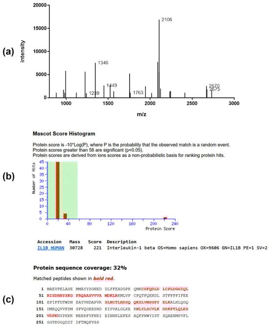 All significantly regulated spots were subjected to peptide mass fingerprint analysis, followed by protein identification. A typical example for the identification of a protein of interest from PC-3 cells is presented in Figure 5 by the identification of IL1B (Interleukin-1β). The expression of this protein was found to be significantly changed upon treatment with triterpene glycoside (see Table 2).