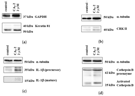 Immunoblots of keratin 81 (a), CrkII (b), IL-1β (c), and cathepsin B (d) upon treatment of PC-3 cells for 48 h with CA2-2.