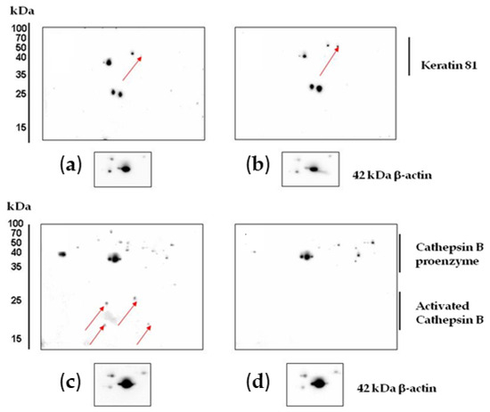 Results of 2D Western blot analysis of changes in the expression of keratin 81 in control (a) and CA2-2-treated cells (b). Cathepsin B control (c) and CA2-2-treated PC-3 cells (d). CA2-2 was used at 2 μM for 48 h. The arrows on the gels indicate the spots corresponding to the studied proteins.