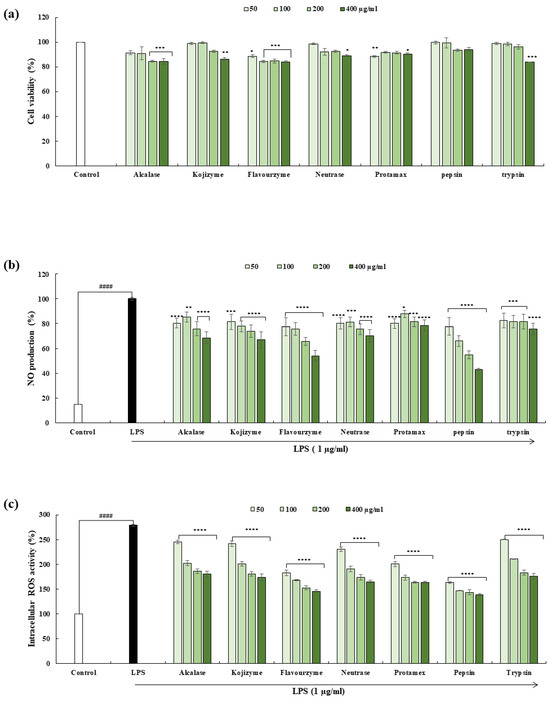 A DCF-DA assay was performed to evaluate the effect of hydrolysates on intracellular ROS production. Before stimulation with LPS (1 µg/mL), the cells were pretreated with different doses of 50–400 µg/mL. After incubation, DCFH-DA reagent (500 µg/mL) was added for 1 h, and the fluorescence was measured using a microplate reader at 485 nm for excitation and 525 nm for emission [11].