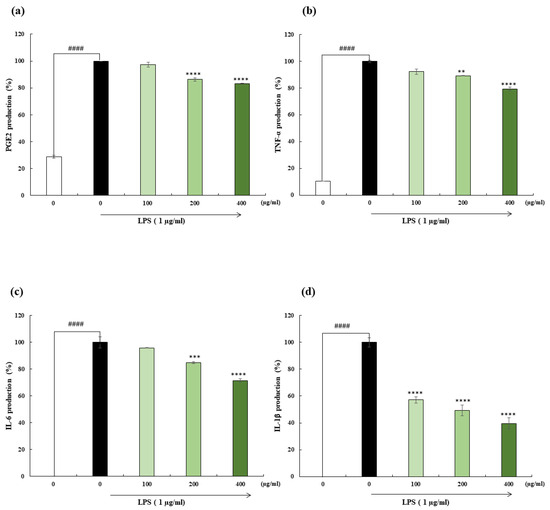 The cell viability was analyzed using an MTT assay. This experiment was conducted according to a previously described method. Briefly, macrophages were seeded at a seeding rate of 1 × 105 cells/well in 96 well plates and incubated for 24 h, followed by treatment with different concentrations (50–400 µg/mL). Following 24 h of incubation, 50 µL MTT solution was added to the cells for a period of 2–3 h. After removing the MTT solution, 200 µL of DMSO reagent was added to dissolve stained formazan crystals and the absorbance was measured at 540 nm measured using a SpectraMax M2 microplate reader (Molecular Devices, San Jose, CA, USA) [30].