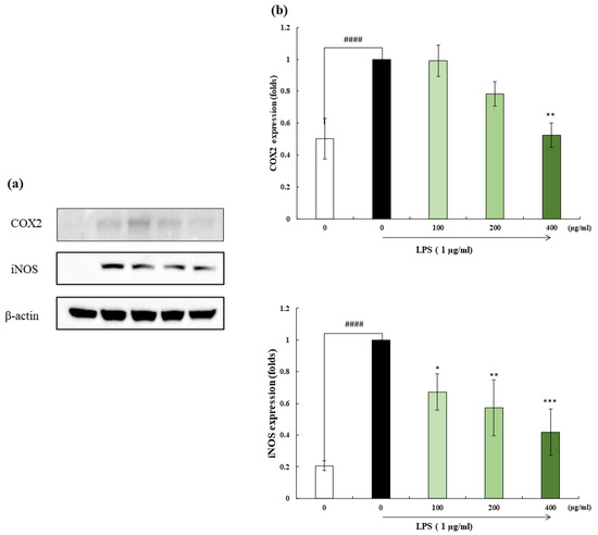 Western blot analysis was performed according to a previously described method to determine the protein expression levels. Three different concentrations (100–400 µg/mL) were selected and treated to the cells following a procedure similar to the above-mentioned procedure. Briefly, the cells were lysed and centrifuged to collect the supernatant (15,000 rpm at 4 °C). The protein concentration of each supernatant was determined using a BCA protein assay kit. Proteins were separated using 12% sodium dodecyl sulfate-polyacrylamide gel electrophoresis. The separated protein bands were transferred to a nitrocellulose membrane and blocked with 5% skim milk. The membranes were incubated with primary and secondary antibodies, followed by visualization of the protein bands [33]. Signals were developed using a chemiluminescent substrate and bands were visualized using a FUSION SOLO Vilber Lourmat system. The results were quantified using the ImageJ software. Using western blotting, iNOS and COX-2 proteins were examined.