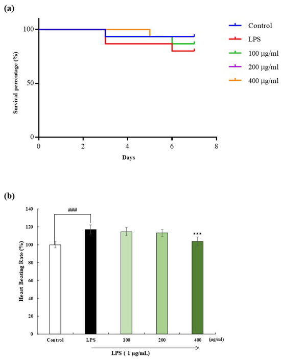 Zebrafish embryos obtained through natural spawning induced by light were collected within 30 min. After 7–9 h post-fertilization (hpf), the collected embryos were transferred to a 12-well plate (15 per well) and 1 mL of embryo media was added. Different concentrations of OFH–PH (100, 200, and 400 μg/mL) were treated and incubated for 1 h. Following the incubation, the embryos were induced by LPS (1 µg/mL) and continued the incubation for 24 hpf. Live embryos were counted 3 d after fertilization in order to determine the survival rate. For further analysis, surviving larvae were used. As stated in prior studies, the heart rate of the atrium and ventricles was recorded for 1 min after 2 dpf with a microscope [26].