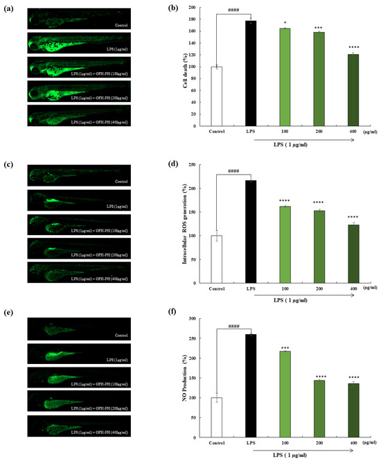 The survival percentage and heartbeat rate were monitored to determine the effect of OFH–PH on LPS-induced zebrafish embryos. As demonstrated in Figure 5a, a survival rate of around 70% was observed in the LPS-stimulated embryos. However, the reduced survival rate was significantly increased dose-dependently with the treatment of OFH–PH. Furthermore, Figure 5b illustrates that LPS slightly increased the heart rate, whereas OFH–PH normalized the elevated heartbeat rate of the LPS-induced zebrafish embryos. Inflammatory responses and oxidative stress stimulate cell death, the overproduction of ROS, as well as NO production; therefore, the protective effect of OFH–PH against LPS-induced cell death, intracellular ROS activity, and NO production in zebrafish embryos was evaluated.