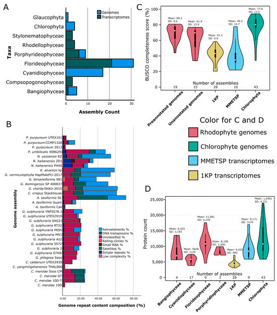 Overall assembly statistics for Rhodophyte assemblies. (A). Total counts of genome and transcriptome assemblies were used in this study. Chlorophyte assemblies that only had their assembly statistics measured were not included in this count. (B) Repeat content of Rhodophyte genome assemblies as predicted by RepeatModeler and RepeatMasker. Repeat types were collated into overarching categories as described by RepeatMasker. (C) Violin plot of the BUSCO scores of the final protein annotations for each assembly. Assemblies with downloadable protein annotations were classified as pre-annotated, while those without prior annotations were classified as unannotated. (D) Protein counts of Rhodophyte genome assemblies by class, transcriptome assemblies by source, and an outgroup. Chlorophyte protein counts were taken from pre-annotated genome assemblies from the NCBI Assembly database.