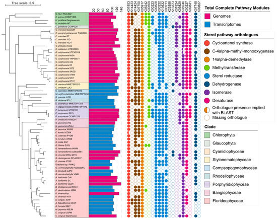 Interestingly, 7-dehydrocholesterol (K00213) reductase was not observed in the Cyanidiophyte algae, while it was annotated in most other assemblies. Likewise, delta24-sterol reductase (K09828) was not annotated in the Galdieriales, while cholestenol delta-isomerase was, indicating that Cyanidiophytes may possess a sterol biosynthesis pathway that is distinct from other Rhodophytes.