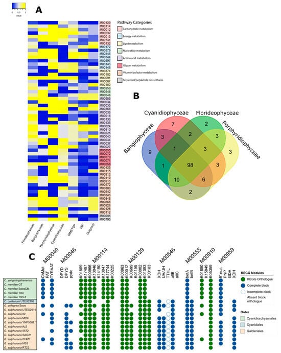 Comparison of metabolic pathways with highly variable rates of completion between Rhodophyte classes. (A) KEGG pathway modules with the most variable rates of completion by red algal class or transcriptome source. Pathways with a standard deviation of the population of 0.2 or higher were selected and grouped by pathway category. Rates of completion range from 0 (none complete) to 1 (all complete). Pathways with one block missing were counted as loosely complete and included in this calculation. (B) Venn diagram of KEGG modules for each class. Only complete or loosely complete modules found in 50% of genome assemblies for each class were counted. (C) Completion rates of 8 modules from (A) showed distinct differences between Cyanidiophytes of the orders Galdieriales and Cyanidioschyzonales. C. caldarium of the Cyanidiales was most similar to the Galdieriales. Modules where each orthologue forms a block are shown in green, while modules with blocks representing multiple orthologues are shown in blue. Blank spaces without circles represent absent orthologues/blocks.
