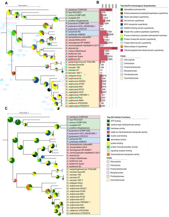 The relationship between metabolic activity and evolutionary history was further investigated using gene duplication analysis with a second run of OrthoFinder v.2.5.4 using the genome assemblies. A total of 22,797 orthogroups were constructed, and 12,512 gene trees were inferred. A species tree was constructed using 353 single-copy orthologues, of which three were universal. The species tree was verified by inferring a maximum-likelihood tree using the same sequence alignment via RAxML-NG [33], which returned the same tree with 100% bootstrapping on all nodes. Gene duplications were extracted from OrthoFinder v.2.5.4 (Supplementary File S2), and the duplicated genes of each major phylogenetic node had their InterPro (Figure 4A, Supplementary Table S3) and GO annotations (Figure 4C, Supplementary Table S4) integrated with the nodes by correlating duplicated genes with their functional annotations (Supplementary File S3).