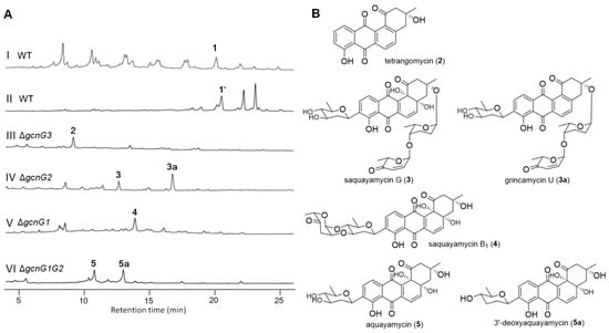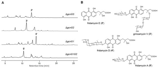The biosynthetic gene cluster gcn contains three putative glycosyltransferase genes, including gcnG1, gcnG2, and gcnG3. The BLAST analysis of the primary amino acid sequence of these genes revealed that gcnG1 and gcnG2 were homologies to O-GTs, whereas gcnG3 was homology to C-GTs (Table S1, Supplementary Materials). A comparison of multiple amino acid sequences revealed that GcnG1 showed homology to SaqGT2 with 54% identity [] and to LanGT4 with 45% identity []. The GcnG2 was homologous to SaqGT4 and UrdGT1c with 58% identity [,,]. The GcnG3 showed similarity to UrdGT2 with 79% identity and to SaqGT5 with 65% identity [,,]. Multiple alignments of amino acid sequences inferred that the GcnG1 and GcnG2 may play a role in governing the transfer of the L-rhodinose unit, whereas the GcnG3 could be responsible for the attachment of D-olivose moiety in the biosynthesis of P-1894B (1) and grincamycin (1′). To confirm the functions of GcnG1, GcnG2, and GcnG3, four mutant strains named Streptomyces lusitanus SCSIO LR32/ΔgcnG1, ΔgcnG2, ΔgcnG3, and ΔgcnG1G2 were constructed by replacing the abovementioned genes using the lambda-RED-mediated gene recombineering strategy []. The mutants were fermented in modified AM2 medium. Subsequently, the culture extracts were analyzed by LC–MS; the resultant compounds were isolated by silica gel column chromatography and semi-preparative HPLC. The structures were identified by HR-MS and NMR methods.