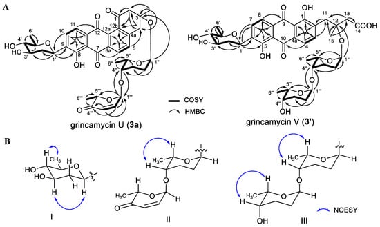 (A) The COSY and HMBC correlations of grincamycins U (3a) and V (3′). (B) The key NOESY correlations of the deoxysugar units in grincamycins U (3a) and V (3′).