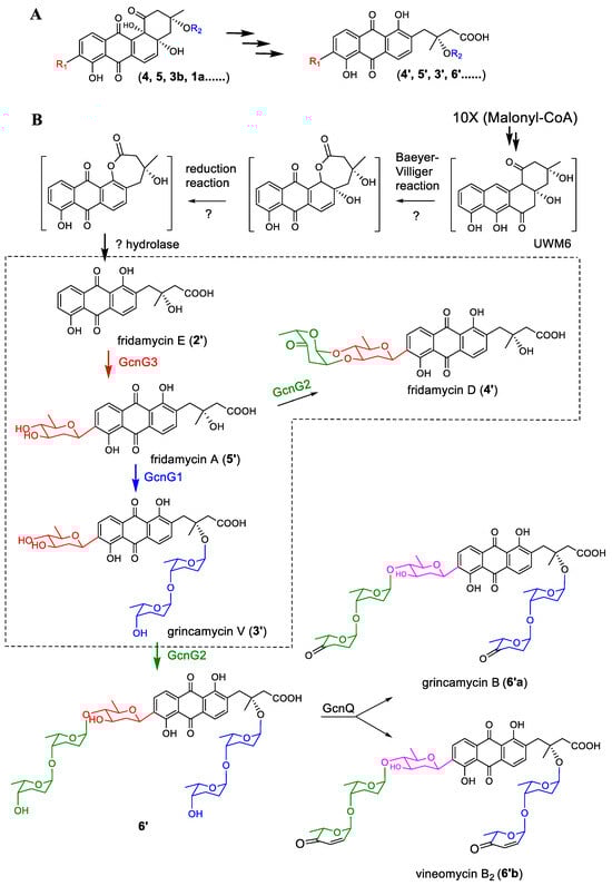 The tricyclic fridamycin E (2′) and three anguacycline glycosides (3′, 4′, and 5′) with fridamycin E (2′) as aglycone were isolated from the mutants cultured in modified RA medium. Previous reports showed that the classic tetracyclic aglycone could be rearranged into the tricyclic aglycone under acidic conditions [,,]. However, the fermentation, extract, and purification procedures for these tricyclic compounds were not treated with any acids. The O-glycosidic bonds in the structures of grincamycin V (3′) and fridamycin D (4′) also proved the acid-free isolation process. Thus, the generation of the tricyclic aglycone angucycline glycosides in the mutant and wild-type strains of SCSIO LR32 could be catalyzed by biosynthetic enzymes. One possible biosynthetic pathway could be that the tetracyclic glycosides (4, 5, 3b, and 1a) were transferred into the compounds with tricyclic aglycone directly (Figure 6A), while another possibility involves the formation of tricyclic aglycone compounds that may be the common intermediate UWM6 of angucycline converted into fridamycin E (2′) firstly, then a serial of glycosylated reactions would occur sequentially under the catalyzation of GcnG3, GcnG1, and GcnG2 to produce the intermediate (6′). Compound 6′ was finally transformed into grincamycin B (6′a) and vineomycin B2 (6′b) as minor products catalyzed by GcnQ in the wild-type strain (Figure 6B).
