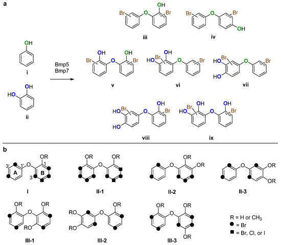(a) Generalized process for the biosynthesis of O-PHDEs. Phenol (i) and catechol (ii) are brominated with Bmp5 (halogens omitted from iii–ix for clarity) prior to Bmp7 bromophenol homocoupling (iii–iv), bromophenol–bromocatechol heterocoupling (v–vii), or bromocatechol homocoupling (viii–ix) [8,9]. Note that no O-PHDE with the oxygenation pattern described as ix has been reported to date. (b) Substitution patterns of all PHDEs isolated from Dysideidae sponges to date. Note that compounds with the oxygenation pattern III-3 cannot be generated solely through the biosynthetic process described in Figure 1a, suggesting that post-translational oxidases or hydroxylases may play a role in this case [9,10].