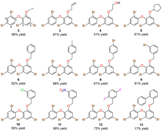 To obtain sufficient quantities of scaffold 1 for semisynthetic studies, an exhaustive extraction of dried and homogenized Lamelloysidea sp. (5 g) was undertaken using a previously reported method that involved extraction with n-hexane and CH2Cl2 [21], followed by silica flash chromatography (n-hexane/EtOAc). This process afforded 1 in high yield (221.3 mg, 4.43% dry wt). A comparison of NMR and MS data with literature values confirmed that the known compound, 2-(2′,4′-dibromophenoxy)-3,5-dibromophenol (1), had been obtained [13,16].