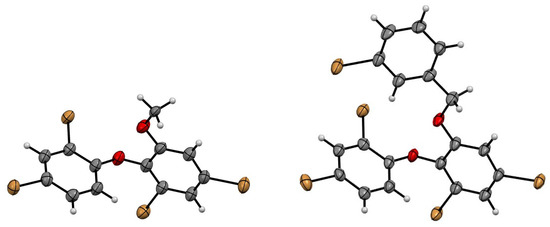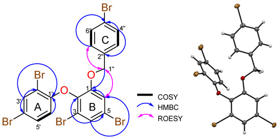 For example, the HRESIMS of O-PHDE analogue 8 revealed an ion at m/z 688.6566 [M + Na]+ that enabled a molecular formula of C19H1179Br5O2 to be assigned to the new semisynthetic. The 1H NMR spectrum (Table 1) of 8 in DMSO-d6 indicated the presence of five aromatic protons from the scaffold [δH 7.90, 7.63, 7.56, 7.41, 6.53], four additional aromatic protons [δH 7.48 (2H), 7.05 (2H)], and two methylene protons [δH 5.12 (2H)]. The 13C NMR and edited HSQC spectra of 8 (Supplementary Figures S46 and S48) indicated a total of 17 unique carbon signals, including 12 aromatic carbons from the scaffold [δC 152.7, 151.9, 139.8, 135.2, 131.7, 127.1, 119.1, 117.9, 117.8, 116.3, 114.4, 111.8], four additional aromatic carbon signals [δC 135.2, 131.2 (2C), 129.3 (2C), 121.2], and a methylene carbon [δC 69.8]. The methylene resonating at δH 5.12 (H-1″) showed strong ROESY and HMBC correlations to H-6 and C-1 respectively, which connected ring B of the O-PHDE scaffold to ring C (Figure 3). The remaining NMR signals for 8 were assigned following extensive NMR data analysis and a comparison of the chemical shifts for the previously reported scaffold 1 (Table 1 and Figure 3). Furthermore, crystals obtained for compound 8 were analyzed via X-ray crystallography and confirmed the NMR-based structure assignment; the ORTEP for 8 is shown below in Figure 3. Additionally, crystals obtained for compounds 2 and 9 were also analyzed via X-ray crystallography, which confirmed their NMR-based structure assignments; the ORTEPs for 2 and 9 are shown below in Figure 4.