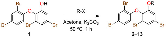 Scaffold 1 (10 mg) was subsequently reacted with a series of commercially available alkyl halides (R-X) in dry acetone for 1 h at 50 °C, using K2CO3 as a base (Scheme 1 and Figure 2). The reactions were initially tested in laboratory-grade and deuterated acetone, where it was found that deuterated acetone was sufficiently dry for the reactions to take place with low-to-excellent yields. Following a workup with CH2Cl2/H2O partitioning and HPLC purification (MeOH/H2O/0.1% TFA), a total of 12 analogues (2–13), including one naturally occurring O-PHDE (2) [22], were obtained in yields ranging from 17 to 99%, and purities of >95%, as determined by UHPLC-MS analysis. Furthermore, all O-PHDE derivatives were fully characterized via 1D/2D NMR, UV, and MS data analyses.