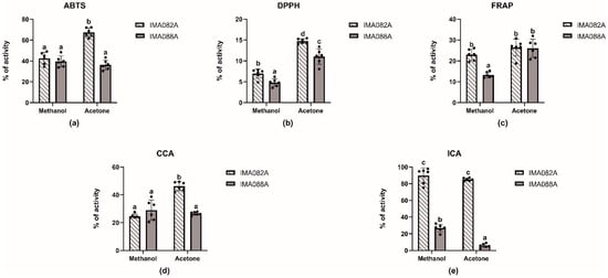 Antioxidant activities of the acetone and methanol extracts of C. ineffabilis IMA082A and C. zucchelli IMA088A. Radical scavenging activity on ABTS•+ (a) and DPPH• (b) radicals, FRAP (c) CCA (d) and ICA (e). Results are expressed as antioxidant activity (% of activity) at the concentration of 10 mg/mL. The letters above the bars in the bar charts indicate significantly different groups (Multiple Comparisons of Means: Tukey’s HSD, 95% family-wise confidence level).