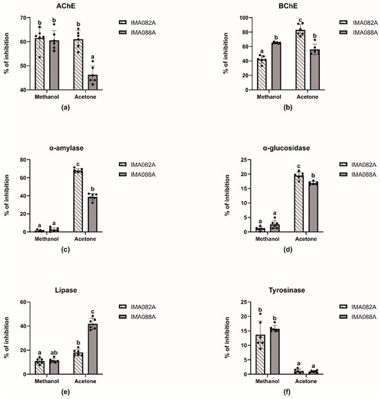 Enzymatic inhibitory properties of the acetone and methanol extracts C. ineffabilis IMA082A and C. zucchelli IMA088A. Results are expressed as inhibitory activity (% of inhibition) at the concentration of 10 mg/mL. The letters above the bars in the bar charts indicate significantly different groups (Multiple Comparisons of Means: Tukey’s HSD, 95% family-wise confidence level).