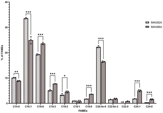 FAMEs profiles of C. ineffabilis IMA082A and C. zucchelli IMA088A. Results are expressed as percentage of total FAMEs. Asterisks indicate statistically significant differences (‘***’ = p–value < 0.001; ‘**’ = p–value < 0.01 and ‘*’ = p–value < 0.05).
