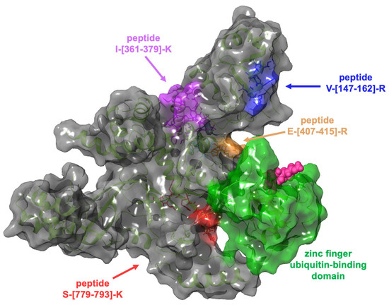 Three-dimensional representation of USP5: the zinc finger ubiquitin-binding domain (coloured in green) is near the tryptic peptide S-[779-793]-K, which was identified in t-LiP-MRM-MS experiments.