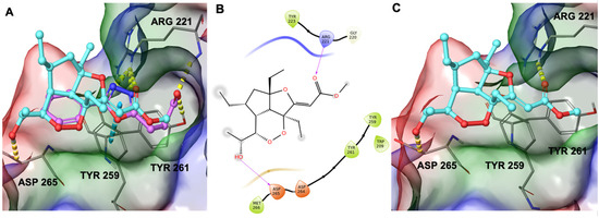 Therefore, during our in silico investigation, we considered that the compound under investigation could bind to ZnF-UBD, which was previously identified as the binding site of new inhibitors of USP5 [19] featuring a carboxylate group. This chemical moiety was responsible for H-bonds with Tyr261 and Arg221 (Figure 5A). Remarkably, the C-terminal diglycine ubiquitin, an endogenous USP5 substrate, establishes the same interaction network. Additionally, these known inhibitors were able to make a π-π stacking interaction with Tyr259 [19]. Given the involvement of the carboxylate group of known inhibitors in the interaction with the protein, we investigated whether the ester group of GeA could establish similar interactions. Starting from these pieces of information, we employed molecular docking experiments on ZnF-UBD (PDB code: 6DXT [19]) using Glide software [20,21,22] (Schrödinger Suite). Computational results showed that GeA can reproduce a similar accommodation of the inhibitor named HHY [19] originally co-crystallized in the protein structure (Figure 5A and Figure S3) and, specifically, it established the key H-bond interaction with Arg221 and an additional H-bond with Asp265 (Figure 5B,C).