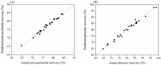 Correlation between experimental and predicted values of polysaccharide (A) and phenolic recovery (B).