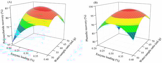 Figure 2A and Figure 2B, respectively, illustrate the combined effect of enzyme loading and the water-to-sample ratio on polysaccharide and phenolic recovery when maintaining other extraction factors at a constant. A similar trend was found for the extraction of polysaccharide and phenolic compounds. At a specific enzyme loading, increasing the water-to-sample ratio increased the polysaccharide and phenolic recovery. However, a further increase in the water-to-sample ratio caused the reverse effect. This could be because a sufficient amount of water is required for the optimal activity of an enzyme, but enzyme stability and activity may decrease with excess water, lowering cell disruption and extraction efficiency [28,38]. This finding corresponds to that of the enzymatic extraction of phenolics from banana peel [39], and polysaccharide extraction from Scutellaria baicalensis root [29] and Corbicula fluminea [40].