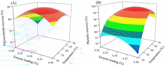Combined effect of enzyme loading and temperature on polysaccharide (A) and phenolic recovery (B).