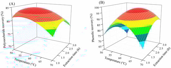 Combined influence of temperature and extraction time on polysaccharide (A) and phenolic recovery (B).