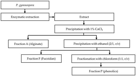 The extract obtained from the optimal extraction conditions was subjected to a fractionation process to obtain alginate (fraction A), fucoidan (fraction F), and phenolic (fraction P)-rich fractions, as shown in Figure 5. Briefly, 1% CaCl2 was added to the extract to precipitate calcium alginate. The calcium alginate was then converted to sodium alginate by dissolving it in Na2CO3, followed by precipitation with ethanol (2:1, v/v). The resulting supernatant obtained after precipitation with CaCl2 was mixed with ethanol (2:1, v/v) and placed at 4 °C overnight. The solution was then centrifuged to obtain the precipitate (the fucoidan-rich fraction) whereas the supernatant was collected, ethanol removed, and fractionated with chloroform (1:1, v/v) to obtain the chloroform fraction (fraction P). All fractions were subsequently freeze-dried and used for further experiments [52,53].