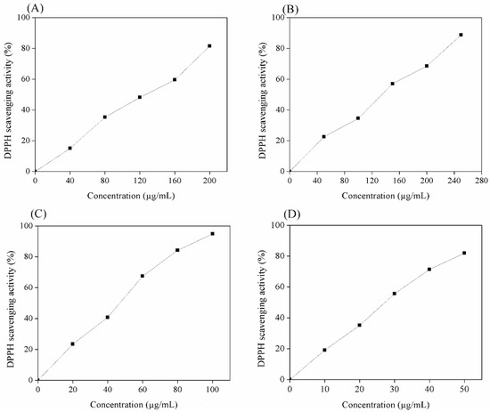 DPPH scavenging activity of fraction F (A), fraction A (B), fraction P (C), and ascorbic acid (D).
