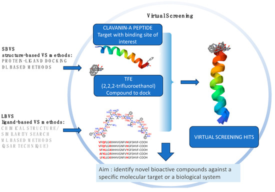 Finally, the protein structure is another important aspect to investigate in drug discovery as it allows us to understand the structural interactions, investigating the potential functionality of a protein and acquiring information on important binding domains for target proteins. Indeed, most drug targets are proteins that play essential roles in enzymatic activities, cell signaling, and cell–cell transduction. Although conventional experimental techniques, such as X-ray crystallography, cryogenic electron microscopy, and nuclear magnetic resonance spectroscopy have been proposed to investigate potential protein structures, they are still time-consuming and costly. Therefore, AI technology can help develop novel methods to fill the gap between the number of protein sequences and known protein structures. Virtual Screening (VS) is a computational approach that allows the prediction of the 3D structure of a chemical compound or a potential bioactive molecule against a specific target (Figure 3). It can be divided into ligand-based and structure-based methods. The former is used when very little structural information is available for the target and a set of active ligand molecules is known. Ligand-based methods include pharmacophore modeling and quantitative structure–activity relationship (QSAR) methods. The latter is used to model the interaction between a small molecule with a target protein at the atomic level, thus characterizing the behavior of small molecules in the binding site of target proteins and elucidating fundamental biochemical processes [113].