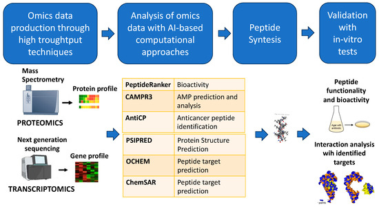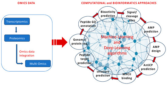 By using ML algorithms, computers can learn without explicitly being programmed. It accomplishes prediction and classification tasks through pattern detection without using defined rules. Many bioactive compound analysis and identification methods use ML [116]. Several types of omics data, such as transcriptomics and proteomics, can be used alone or can be integrated into a multi-omics approach to be further analyzed by different computational methods based on AI (Figure 4). Different steps can be completed starting from genome or proteomic sequences to identify and analyze different features of potential bioactive molecules.