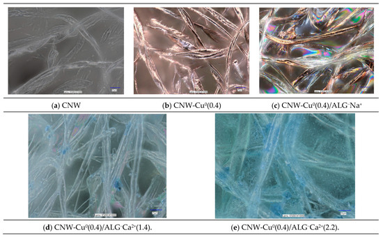 The images presented microscopic views of various cellulose nanofiber samples: CNW; CNW-Cu0(0.4); CNW-Cu0(0.4)/ALG−Na+; CNW-Cu0(0.4)/ALG−Ca2+(1.4); and CNW-Cu0(0.4)/ALG−Ca2+(2.2). Each sample was examined under a microscope with magnifications 1000×, facilitating a detailed analysis of their structural and material characteristics (Figure 3).