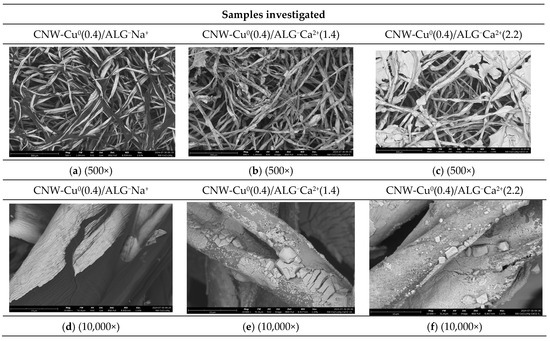 Scanning electron microscope (SEM) images of samples: CNW-Cu0(0.4)/ALG−Na+ (a,d); CNW-Cu0(0.4)/ALG−Ca2+(1.4) (b,e); and CNW-Cu0(0.4)/ALG−Ca2+(2.2) (c,f). Images were taken for magnification 500× and 10,000.