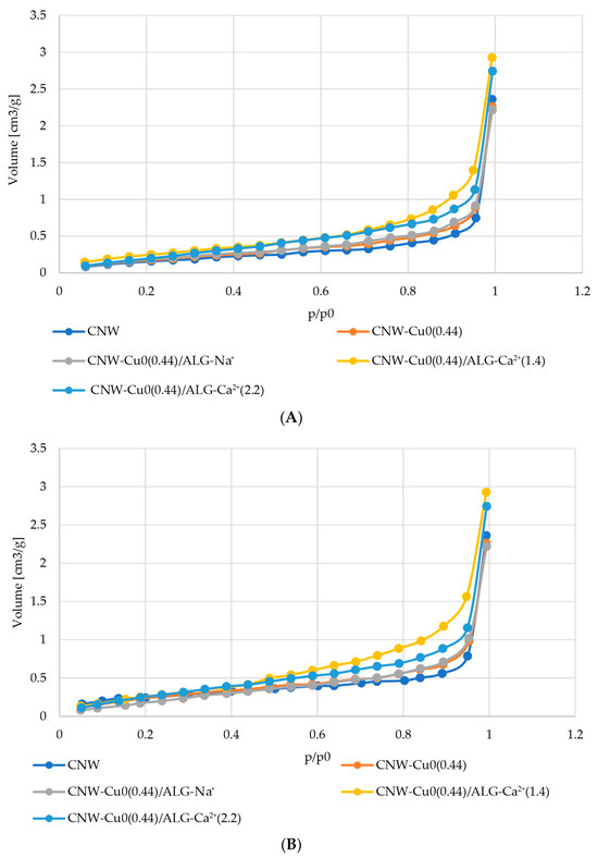 The nitrogen adsorption and desorption isotherms for CNW, CNW-Cu0(0.44), CNW-Cu0(0.44)/ALG−Na+, CNW-Cu0(0.44)/ALG−Ca+2(1.4), and CNW-Cu0(0.44)/ALG−Ca+2(2.2) samples are depicted in the collective Figure 5. Individual adsorption-desorption isotherms for the above compounds are listed in the Supplementary Materials (Figure S5).