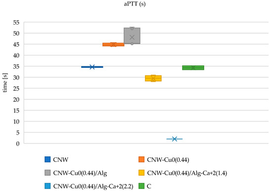 The influence of the tested copper-coated cellulose nonwoven fabrics on aPTT: CNW; CNW-Cu0(0.44); CNW-Cu0(0.44)/Alg; CNW-Cu0(0.44)/Alg−Ca2+(1.4); CNW-Cu0(0.44)/Alg−Ca2+(2.2) samples, and a plasma control (C). The data is represented with the mean (×), median (horizontal line), range (bars), and interquartile range (box).