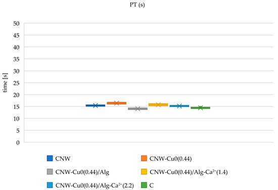 The influence of the tested copper-coated cellulose nonwoven fabrics on PT: CNW; CNW-Cu0(0.44); CNW-Cu0(0.44)/Alg; CNW-Cu0(0.44)/Alg−Ca2+(1.4); CNW-Cu0(0.44)/Alg−Ca2+(2.2) samples, and a plasma control (C). The data is represented with the mean (×), median (horizontal line), range (bars), and interquartile range (box).
