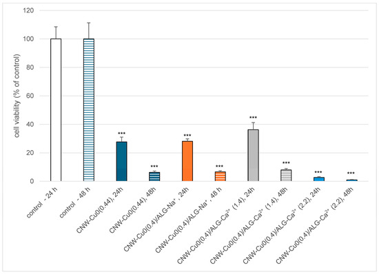As the continuation of our research program directed on biologically active polymer-metal materials with potent medical application [42,43,44,45,46,47,48,49,50,51], we proposed the synthesis of cellulose nonwoven fabric charged with metallic copper core (CNW-Cu0) and covered with calcium alginate (ALG−Ca2+) layer, namely CNW-Cu0/Alg−Ca2+ materials.
