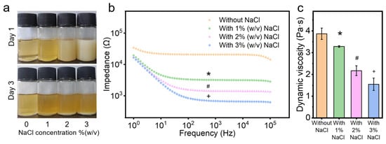 Properties of chitosan solutions with and without NaCl: (a) images of electrospun chitosan solutions on day 1 and day 3, (b) impedance, and (c) dynamic viscosity. *, #, and + denotes significant differences between groups.