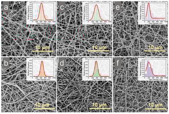 SEM images of electrospun chitosan membranes and the corresponding fiber diameter distribution: (a) CM without post-treatment, (b) CM with TEA/tBOC treatment, (c) SCM (1% NaCl) without post-treatment, (d) SCM (1% NaCl) with TEA/tBOC treatment, (e) SCM (2% NaCl) without post-treatment, and (f) SCM (2% NaCl) with TEA/tBOC treatment. “CM” denotes “chitosan membrane”, while “SCM” denotes “chitosan membrane with salt”.
