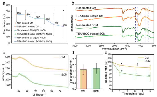 After post-electrospinning treatment, there was no significant change (p > 0.05) in fiber diameter of both CM and SCM membranes. This is consistent with previous studies showing that post-electrospinning treatment with TEA/tBOC does not cause fiber expansion or structural loss [].