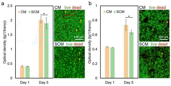Cell culture results of CM and SCM (with 1% (w/v) NaCl). (a) Proliferation of fibroblasts (NIH3T3 cells) on CM and SCM (left), with live/dead staining images on the 5th day (right). (b) Proliferation of osteoblasts (MC3T3E1 cells) on CM and SCM (left), with live/dead staining images on the 5th day (right). * denotes a significant difference (p < 0.05). “CM” represents “chitosan membrane” and “SCM” represents “chitosan membrane with salt”. Arrows indicate dead cells.