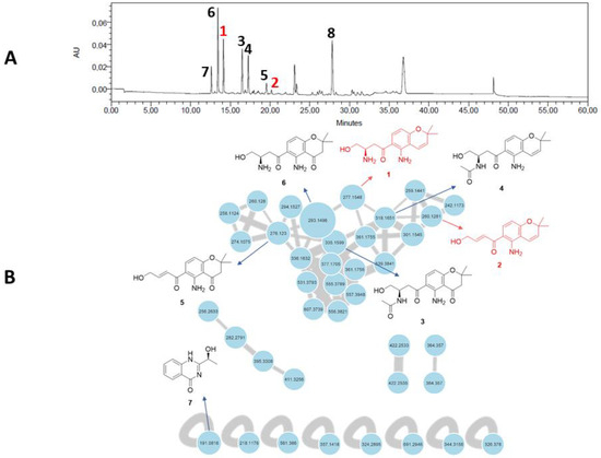 (A) HPLC–UV chromatogram at 280 nm of the crude organic extract of Fusarium equiseti UBOCC-A-117302 (column: NUCLEODUR Sphinx RP 250 × 4.6 mm; mobile phase: H2O-acetonitrile, containing 0.1% formic acid: 90:10 for 5 min, 90:10 to 0:100 over 35 min, then 90:10 for 10 min, with reconditioning until 60 min; flow rate: 1 mL/min; injection volume: 20 µL). (B) Feature-based molecular networking of the crude culture organic extract of F. equiseti UBOCC-A-117302 by ultra-high-performance liquid chromatography coupled to high-resolution tandem mass spectrometry (UHPLC-HRMS/MS) in positive ionization mode (common fragment number: 5; similarity score: 0.5). Node size represents semiquantitative differences in metabolite concentrations in MS1 scan. Edge thickness indicates cosine score similarity between nodes. New molecules are in red, known molecules are in black.
