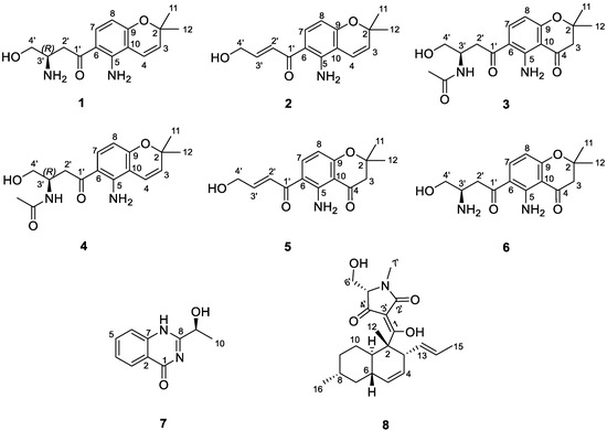An extensive examination of the NMR, HRMS, and optical rotation data of 3–8 and comparison with previously published data [3,4,5,20,21,22] led to their identification as fusarochromanone TDP-2 (3), fusarochromene (4), 2,2-dimethyl-5-amino-6-(2′E-ene-4′-hydroxylbutyryl)-4-chromone (5), fusarochromanone TDP-1 (6), (−)-chrysogine (7), and equisetin (8), respectively.
